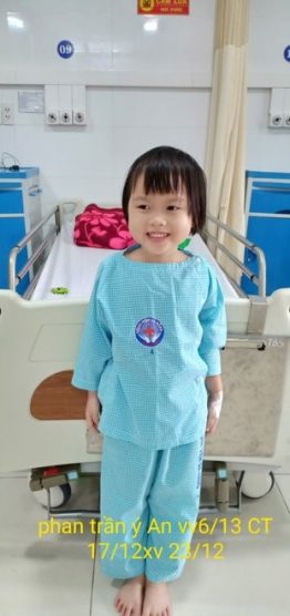 Phan Trần Ý An is a 5 y/o baby girl from Quang Nam with congenital pulmonary stenosis. which causes her to be short of breath even on limited activities. Her parents are farm workers and her mother has to quit job to stay home taking care of her. Without surgery, she probably won’t live past 5 year. Thanks to your generous donation, she had a successful operation to correct her heart defect. This is Ý An smiling after her surgery. |